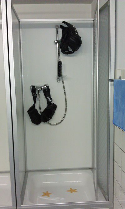 Total verschwitzt ging ich duschen, diesmal aber nicht alleine! Zum ersten Mal nahm ich meinen Helm und die Handschuhe mit, schliesslich hatten die es auch bitter nötig. 🙂