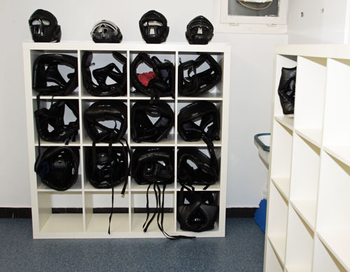 Für alle die ihre Schutzausrüstung in der Krav Maga Schule lassen möchten gibt es nun eine ideale Ablage. Unterhalb der Treppe welche zur Garderobe führt hat es jetzt zwei Gestelle, so könnt Ihr jetzt die Sachen gleich trocknen und danach sauber verräumen. Sobald es die Zeit zulässt werden wir die Fächer noch mit den Namen anschreiben. Bitte vergesst nicht entsprechende Frottéetücher mitzunehmen damit man die Westen im trockenen Zustand versorgen kann!