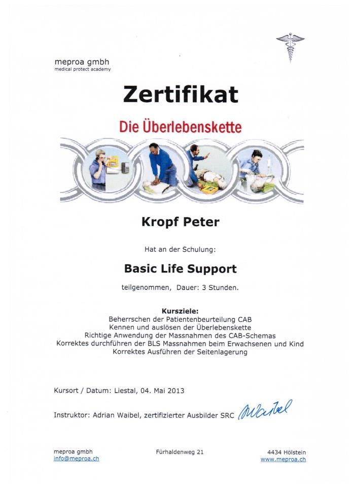 Alle zwei Jahre müssen sich die Schulleiter und alle unterrichtenden Instruktoren neu im Basic Life Support (u.a. Grundlagen einer erfolgreichen Wiederbelebung) zertifizieren lassen. Wir arbeiten mit Menschen und sollte es einmal vorkommen, dass jemand ohmächtig wird, einen Schwächeanfall oder noch schlimmer – einen Herzanfall erleidet, ja dann sollte schnell gehandelt werden können! Denn sofern man keine lebensrettenden Massnahmen einleitet, sinkt die Überlebenschance des Betroffenen bei einem Herzstillstand mit jeder verstreichenden Minute im zweistelligen Prozentbereich.